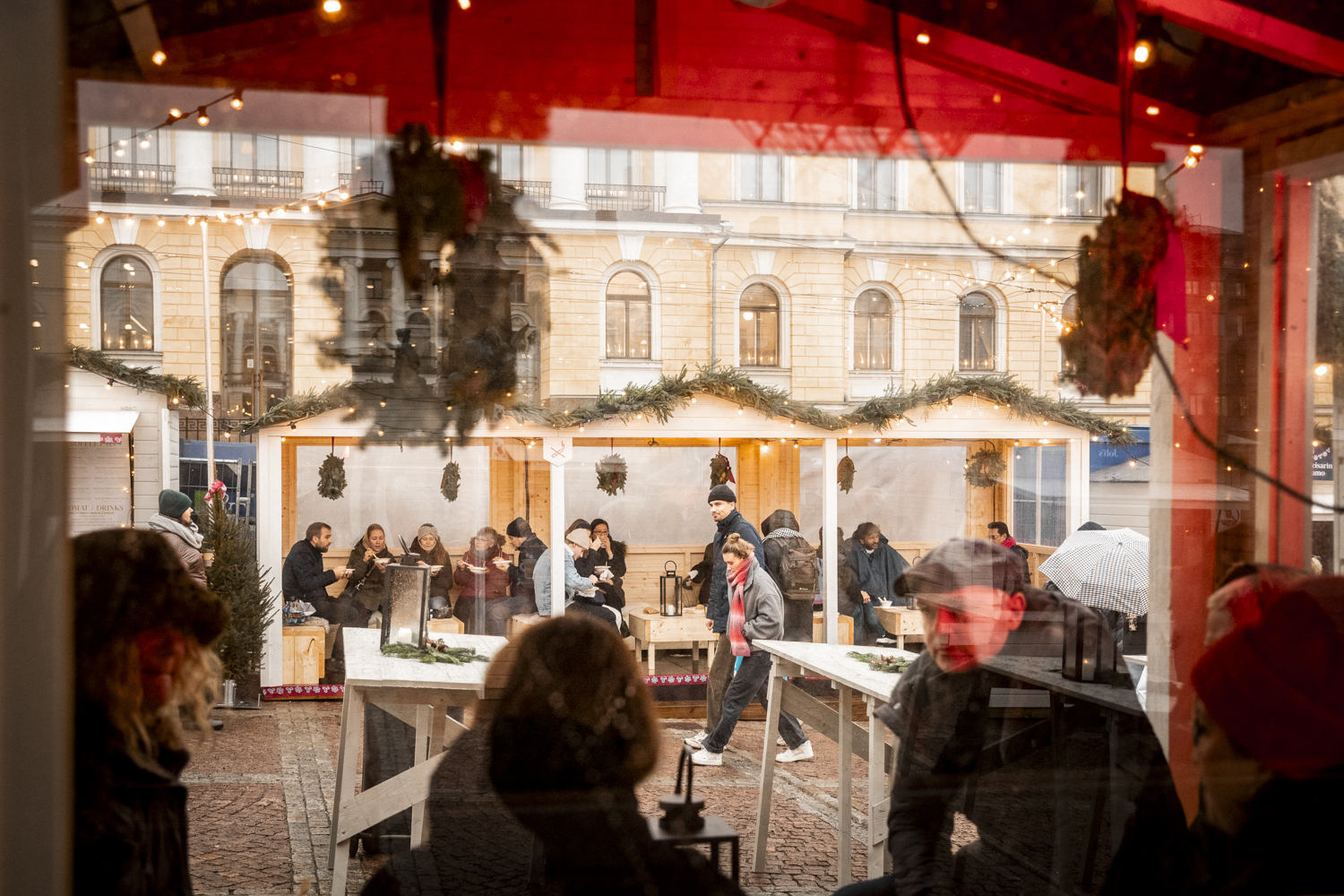 Lämmitetyt ruokailukatokset olivat Tuomaan Markkinoilla ahkerassa käytössä. Kuva:Dorit Salutskij