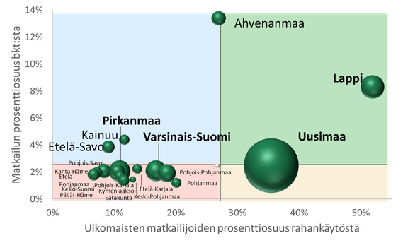 Pallon koko kuvaa kokonaisrahankäyttöä. Yli miljardin euron maakuntia ovat Uusimaa, Lappi, Pirkanmaa ja Varsinais-Suomi. Matkailun BKT-osuus ja ulkomainen rahankäyttö korostuvat Lapissa, Uudellamaalla ja Ahvenanmaalla, kun taas Kainuussa ja Etelä-Savossa korostuu kotimainen kysyntä. Muissa maakunnissa BKT-osuus on pienempi ja painottuu kotimaahan. Risteyskohta kuvaa koko maan keskiarvoa. Visit Finland